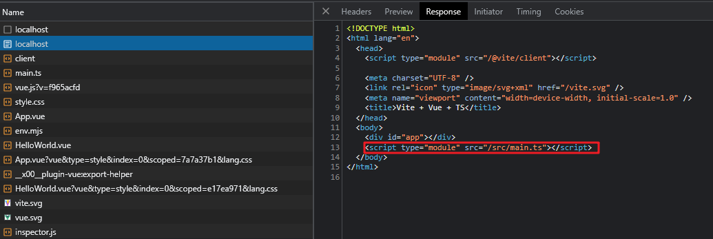 本地启动项目后,可以看到index.html中以原生ES模块的方式,引入了main.js和其他依赖: