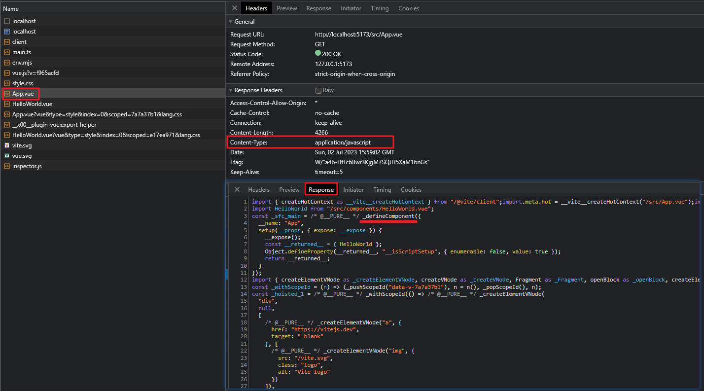 对于浏览器对.vue文件的HTTP请求,通过设置Content-Type: application/javascript,被处理成了浏览器可识别的js逻辑,并且js中用的也是原生ES模块的导入导出语法: