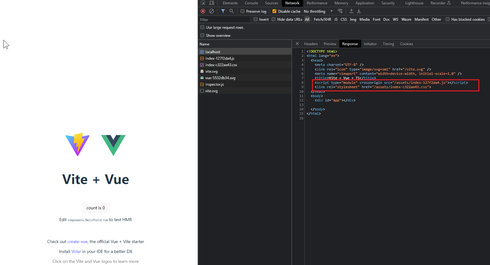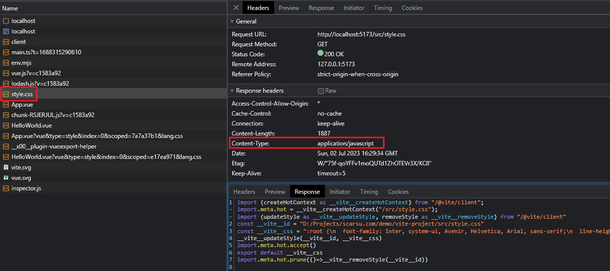 对于css文件:Vite会将浏览器.css文件的HTTP请求设置Content-Type:text/javascript,然后把css文件的内容替换为一段js代码,这段js代码的逻辑就是将对应的css代码作为 <style>标签插入到html文件中,并且支持css的热更新功能。