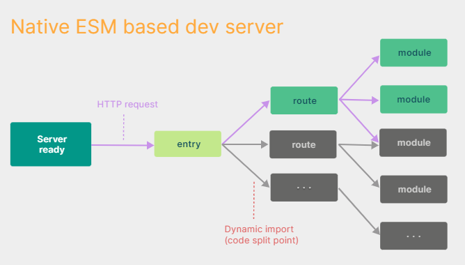 - 一个开发服务器,服务于开发环境,它基于 原生 ES 模块 和ESBuild,提供了 丰富的内建功能:如速度很快的 模块热更新(HMR)。其原理是利用浏览器去解析 imports,在服务器端按需编译返回,完全跳过了打包这个概念,服务器随起随用。