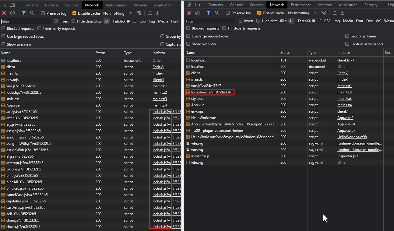 为了解决浏览器网络多包传输的性能问题,ESBuild会分析依赖链,将多模块的import集成到一个模块中去,减少 http 请求数。例如引入lodash-es包的合并前后对比: