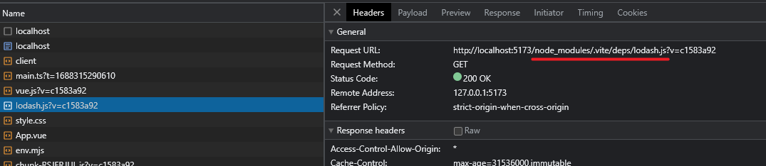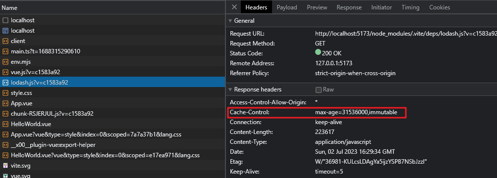 依赖包的HTTP请求会被Vite设置为 Cache-Control: max-age=31536000,immutable 进行强缓存。